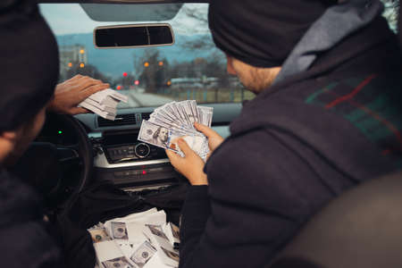 Two happy bank robbers celebrating their successful hit while sitting in the car they used for the robbery.