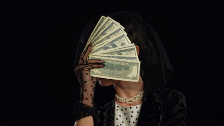 Woman actress in retro outfit with pin-up hairstyle and makeup posing at camera isolated on black background, woman hiding face holding fan of dollar banknotes.