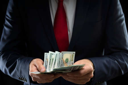 business man wearing suit and necktie holding money in hand on black background, US dollar (USD) bills - investment, success and profitable business concepts