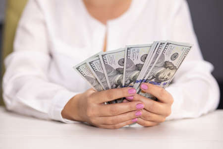 Business Woman Displaying a Spread of Cash US dollars. Close-up. Income and Business concept. Venality, bribe, corruption concept. Hand giving money. Millennial candid authentic female hands counting money usd. Business budget of wealth and prosperity finance