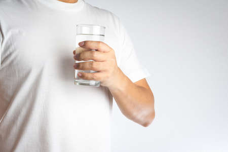 Hand holding a glass of water on white background
