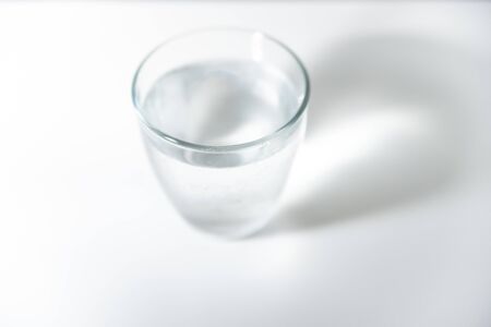 Close-up of half full glass with clear sparkling water on white background.Healthcare and beauty concept