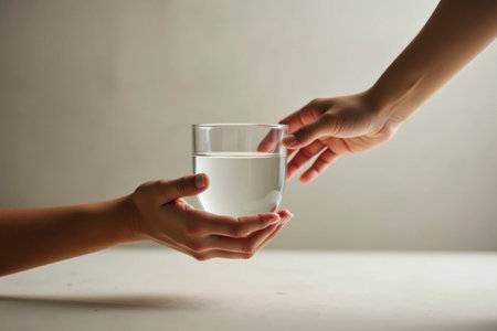 One hand passes a glass of clear water to another person. The scene appears symbolic, emphasizing the sharing of essential resources, as well as trust and care between people.