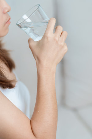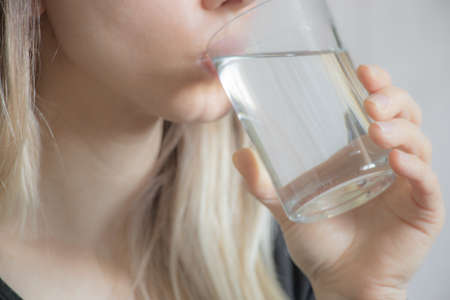 Close up of young woman drinking glass of pure still water. High quality photo