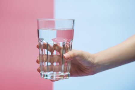 Hand holding transparent glass of water, clean drinking water in a clear glass on two tone (pink and blue) background