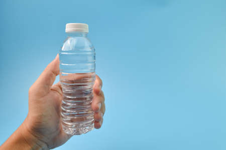 Hand holding mineral water isolated on a blue background. Copy space for the text