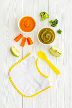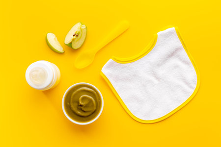 Bib, baby puree, spoon, Apple. The view from the top, flat lay.The concept of healthy nutrition for children. Copy space.