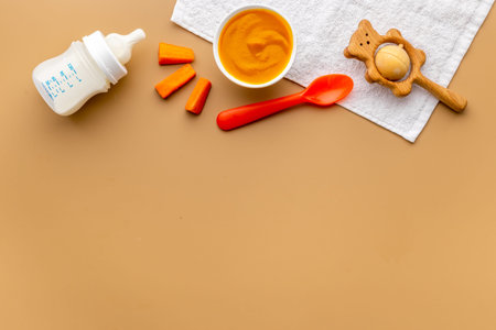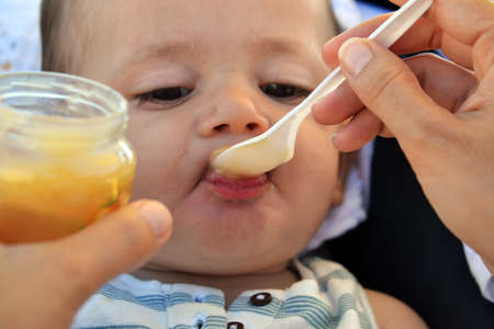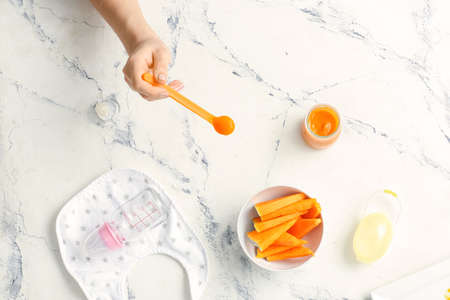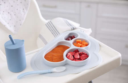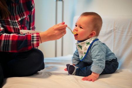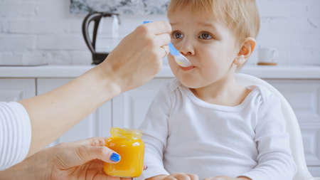 mother holding spoon and feeding baby boy with carrot puree in feeding chair