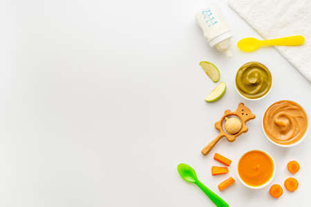 Variety of homemade baby vegetable and fruit puree, white marble background copy space