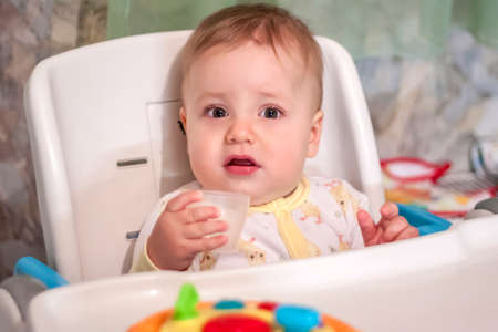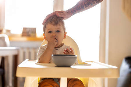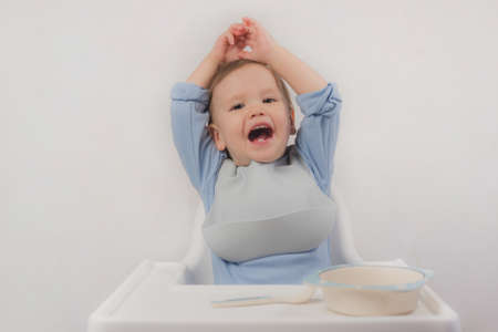 Serious baby sits at baby chair and looking to empty plate. Baby waiting for food in his high chair