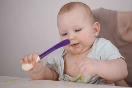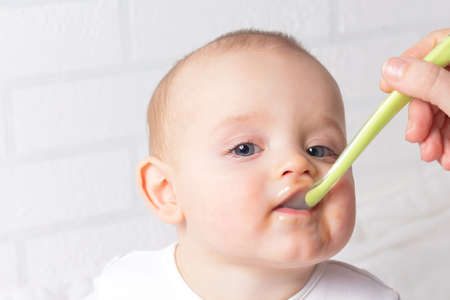 Funny caucasian baby boy getting healthy food. Fist baby food concept. Babys mouth is stained with fruit puree. Light background. Baby plastic spoon.