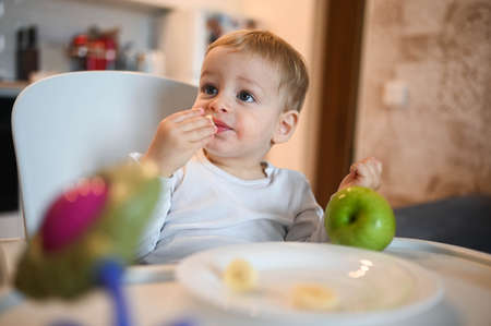 Little happy cute baby toddler boy blonde sitting on baby chair playing with apple. Baby facial expressions indoors at home kitchen interior with food. Healthy eating happy family childhood concept