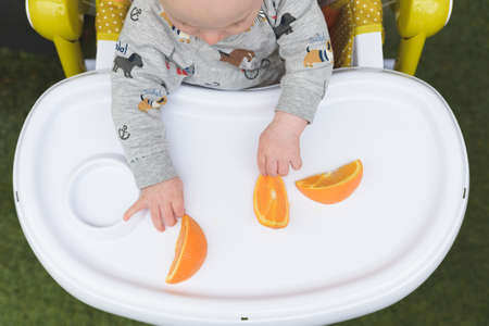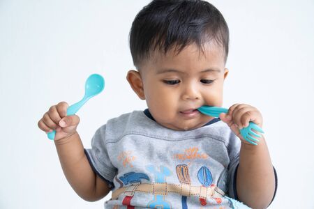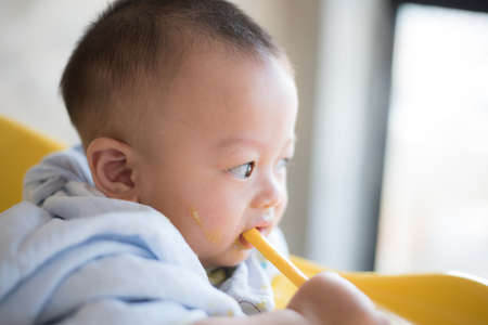 Happy eating Asian baby boy, 7 months old eating with Baby Led Weaning (BLW) method, Baby eat by himself, Self-Feeding