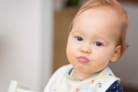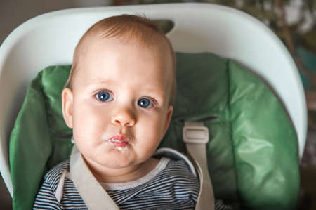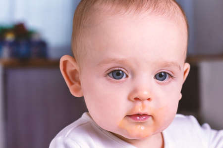 Small caucasian baby with dirty face after eating. First baby fruit puree. Close up photo of caucasian baby boy. Child learning to eat.