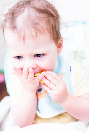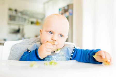 Baby boy eating bread and cucumber with BLW method, baby led weaning. Seriosu vegetarian kid eating lunch. Child eat himself, self-feeding.