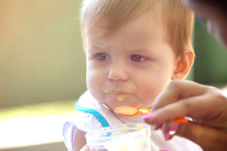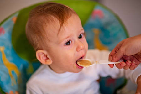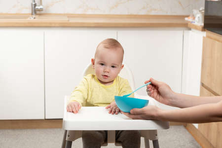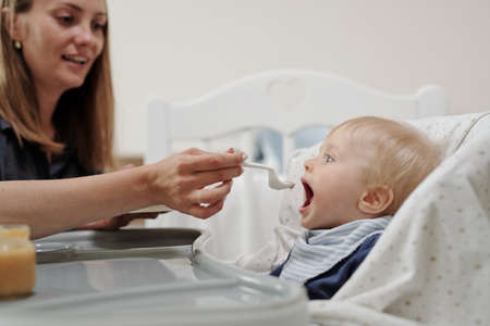 Mother feeds a little boy with a spoon. Mother giving food to her adorable baby at home
