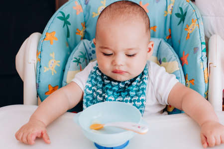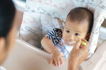 Mother feeding food Cute Asian little baby boy on high chair at home.
