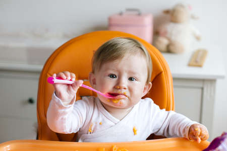 Cheerful baby child eats food itself with spoon. Portrait of happy kid girl in high chair.
