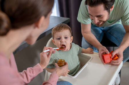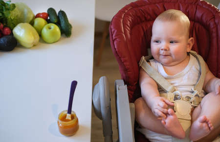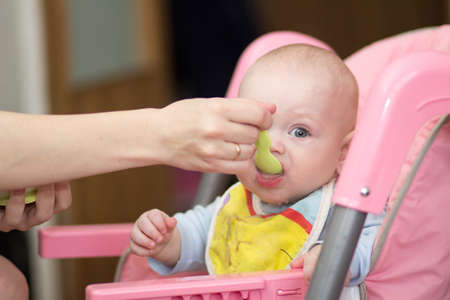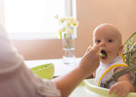 Single mother feeds her little son sitting in a baby chair. The mother feeds a small baby with green leaf pulp. The baby enjoys while eating a meal.
