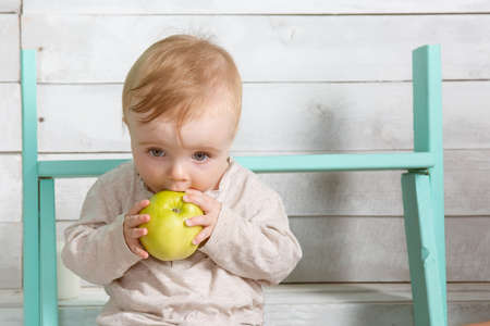 Funny little blond baby boy eats big green apple sitting on the wooden steps and wood background