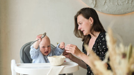 High angle view of mother feeding porridge to baby boy using spoon, introducing first solid food meal, angry baby sitting in high chair refusing food