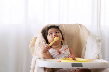 Cute adorable Asian Chinese kid girl sitting in high chair eating soup with spoon. Healthy eating for kids children. Toddler eating independently in kitchen at home. Candid real authentic moments.