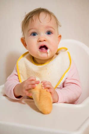 One year old baby girl feeding herself with her fingers, baby led weaning; concept of motherhood and parenting