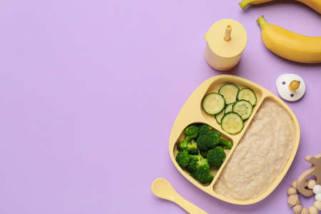 Healthy baby food in plate and accessories on violet background, flat lay. Space for text