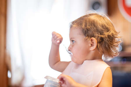 cute baby eating yogurt with spoon by himself. adorable toddler has lunch. hungry child eas food
