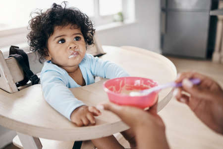More Mommy, more. Shot of an adorable little girl sitting in the kitchen and being fed by her mother.