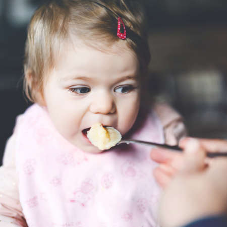 Adorable baby girl eating from spoon mashed vegetables and puree. food, child, feeding and people concept -cute toddler, daughter with spoon sitting in highchair and eating at home.