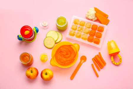 Preparing baby food. Broccoli, pumpkin, apple puree on white background top view