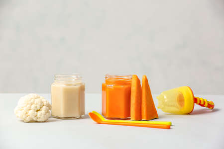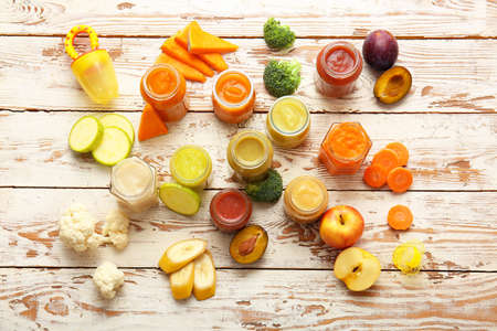 Child eating baby vegetable and fruit puree - apple, broccoli, carrot, pumpkin. Baby food concept.