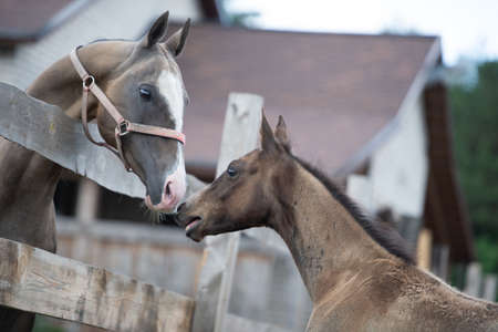 portrait of purebred akhal-teke stallion and foal. cloudy day