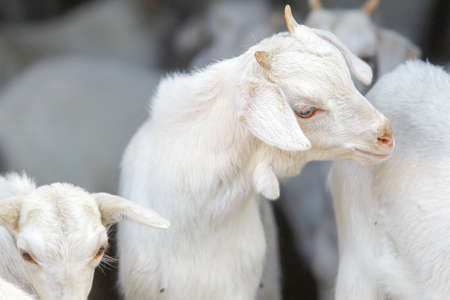 Herd of white goats on a farm in the morning light.