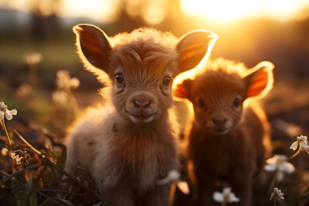 Energetic and joyful young cattle playfully grazing in a sunlit and lush green pasture