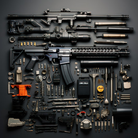 close-up of gun parts on workbench with tools, created with generative ai