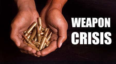 Cartridges lie in a box, a womans hand holds a live cartridge on the background of bullets, military weapons, war in Ukraine