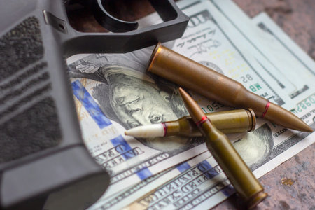 Black gun and bullets on American dollars background. Military industry, war, global arms trade, weapon sale, contract killing and crime concept.