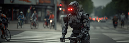 A robot bicycles through a bustling city street at twilight, merging technology with urban life.