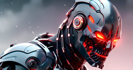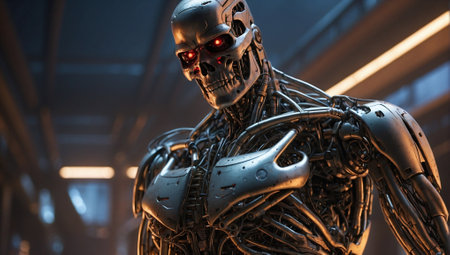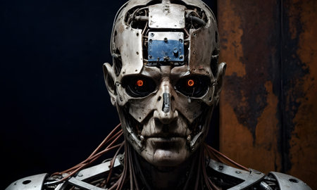 An ominous front-facing portrait of a robot with piercing red eyes. The chilling effect is amplified by the dark background, highlighting the stark features of the mechanical being.