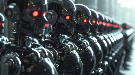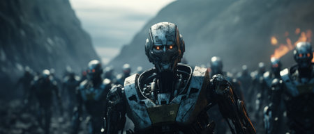 background with an army of advanced robots, technologies, representing artificial intelligence, programming and robotics. Generative AI