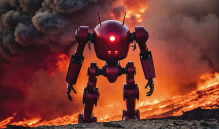 A large, red robot stands on a rocky surface, its glowing red eyes fixed on the viewer