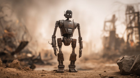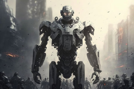 An AI generated illustration of A robotic soldier standing in a city street with a blurry background