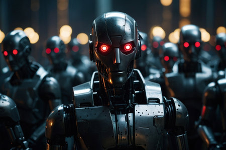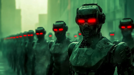 In a bustling, neon-lit metropolis, advanced AI robots walk in synchronized formation. Their glowing red eyes illuminate the dark streets, showcasing cutting-edge technology and design.