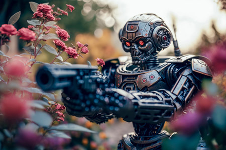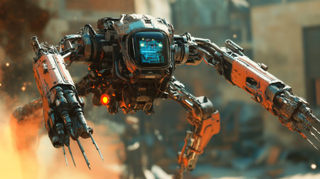 combat robot, armed with machine gun and grenade launcher, ready to take on enemy forces, created with generative ai