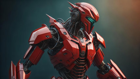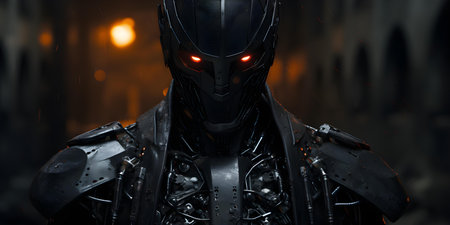 Abstract dark armored cyborg background. Futuristic robot with weapon