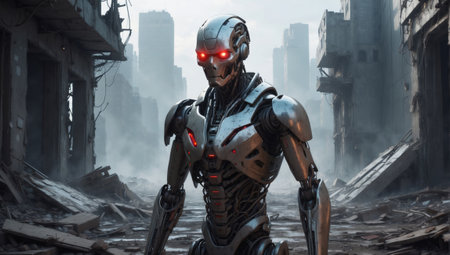 Futuristic Robot Soldier Engaged in Combat With High-Tech Weaponry in Dystopian Cityscape at Dusk