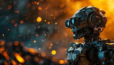Close-up of futuristic robot head on blurred background. Selective focus.