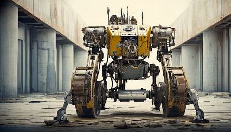 A complex yellow industrial robot stands imposingly in an abandoned warehouse, with intricate mechanical parts and a robust design.. AI Generation